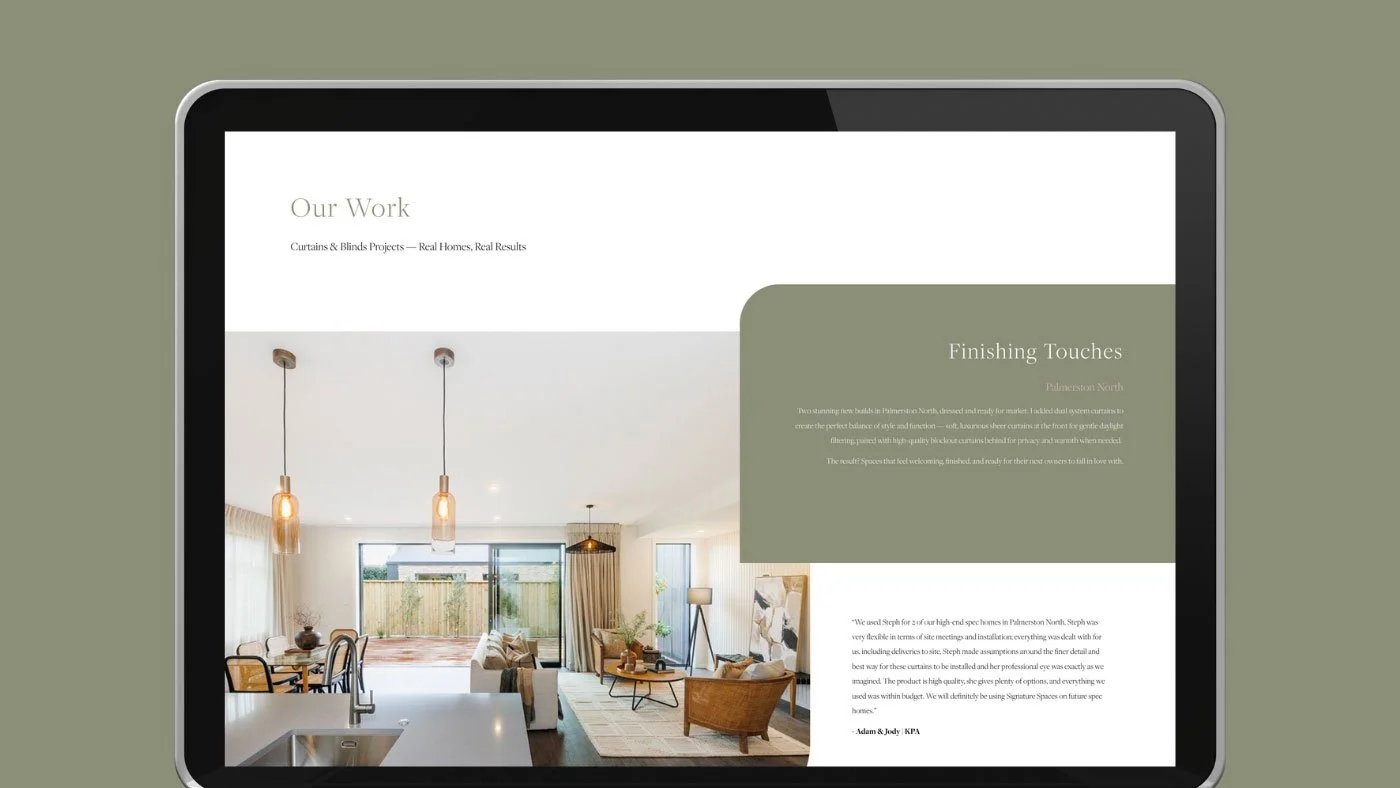 We used her soft, feminine logo as the foundation for the design, pairing it with a fresh colour palette of sage green, blush pink, and plenty of white space. Rounded blocks of colour create a modern, inviting feel that complements the stunning photography of her interior projects.